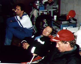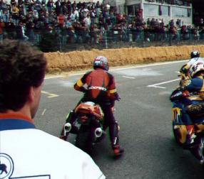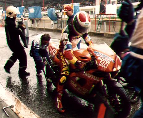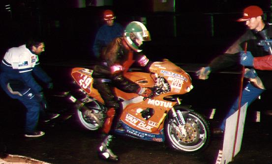 On Wednesday 8 July, the first disaster struck the team with the highly disappointing news that Russel would not come to Francorchamps.. Luckily Yves recommended a fellow rider Peter Deruyter who was to race the Prologue 4 hour race. He was recruited quickly and so we could concentrate on qualifying again, which itself can be a difficult exercise because your laptimes may not be slower than 15% of the fastest rider's time This meant that we would have to ride a few super laps on the 90 bhp bike which ran with normal profile tyres. Thursday 9 July, the first practice day, including a night practice session as well as a qualifying practice. Some adjustments to suspension and gearing were the only necessary things during practice, for the rest the bike ran fine. Qualifying practice started with rain and it was to remain wet. All riders raced for what they were worth but none of the times were fast enough to qualify the team for the race. A nervous night followed and the next morning, the riders knew very well that it would be either 'race' or 'go home'. Imagine the thought . Brrrr.