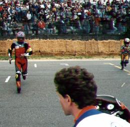 At 11.13 AM, Thierry makes a second crash, this time in the lefthander after the Malmedy same cause, oil on the track makes the front wheel break away all of a sudden. Boy are we happy that we repaired the fairing and tank dummy. The parts were fitted, a clip-on was replaced and off was Thierry for yet an hour, there was no stopping this guy! A warm applause and cheers echo from the stands.