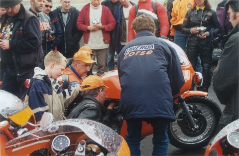 Gijs van Dijk firing up his three cylinder factory racer. Augusto Brettoni and Piero Laverda act as 'choke valve'.